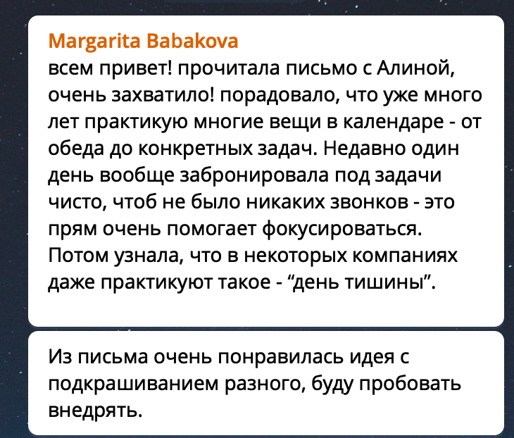 В Алину постоянно летят пули мелких задач и вопросов из чатов. Она отвечает мгновенно, отбиваясь как джедай. Алина любит помогать, поэтому у нее миллион встреч — по своим и чужим вопросам. Но где тогда взять время на глубокую работу?