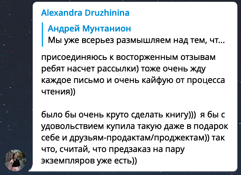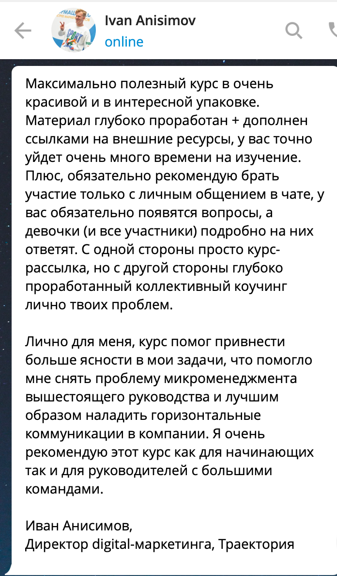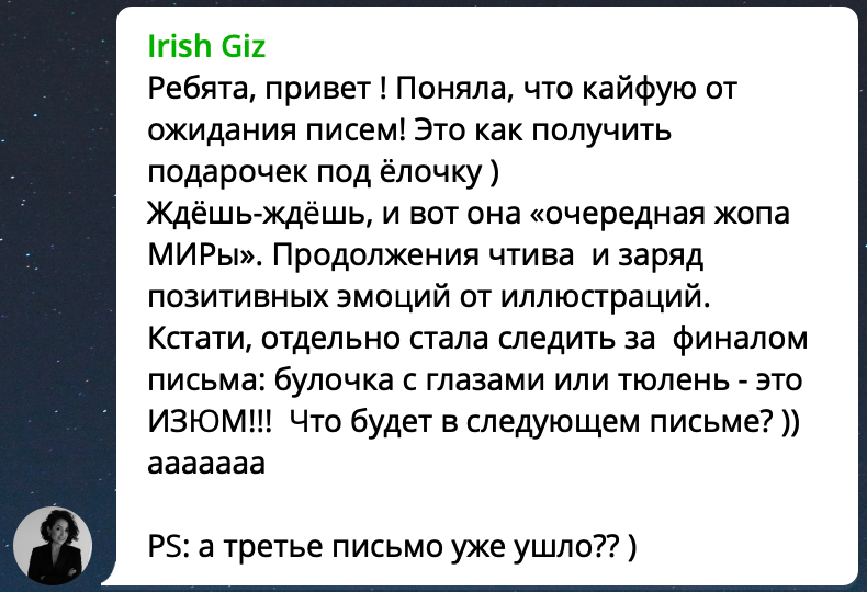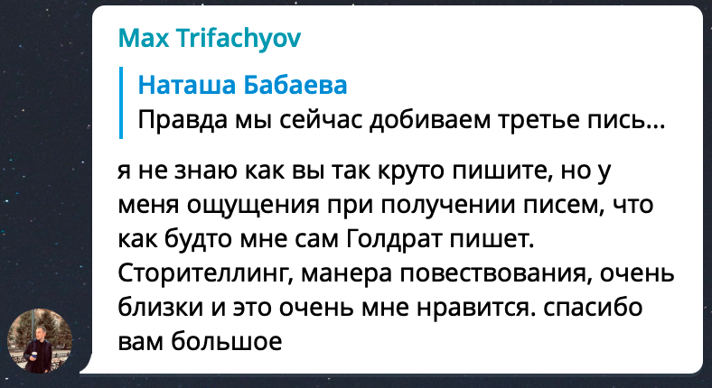 Шесть писем — по одному в неделю. 335 страниц А4 читаются на одном дыхании. Контент остается навсегда