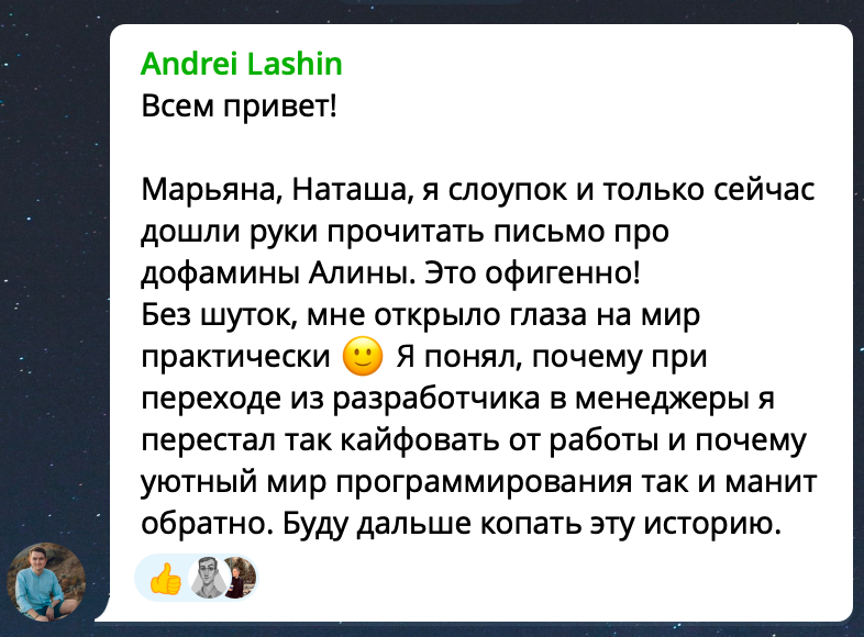Всем в команде пофиг на результат, кроме Антохи. В чатике и на встречах сплошные выяснения отношений. Если кто-то ошибается — его готовы распять, если все хорошо — воспринимают как должное