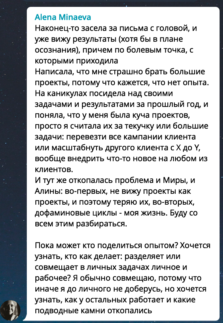 Подводя итоги последнего года работы, Алина поняла: она распылялась, больших достижений не видно. Просит нас помочь
